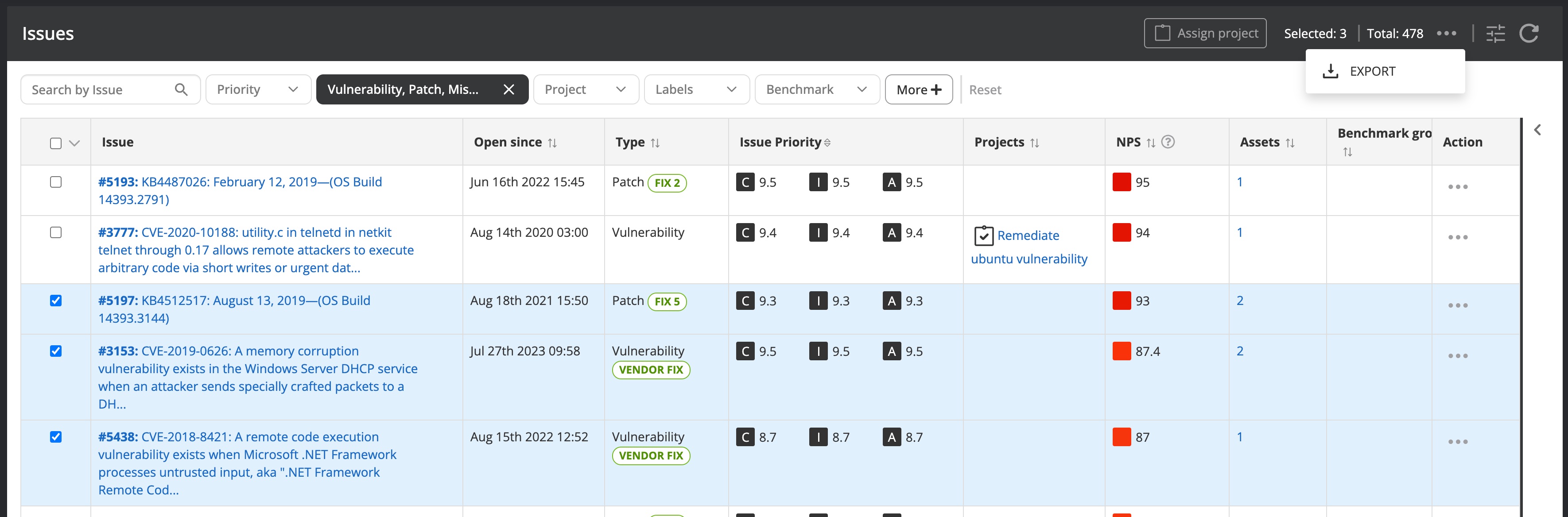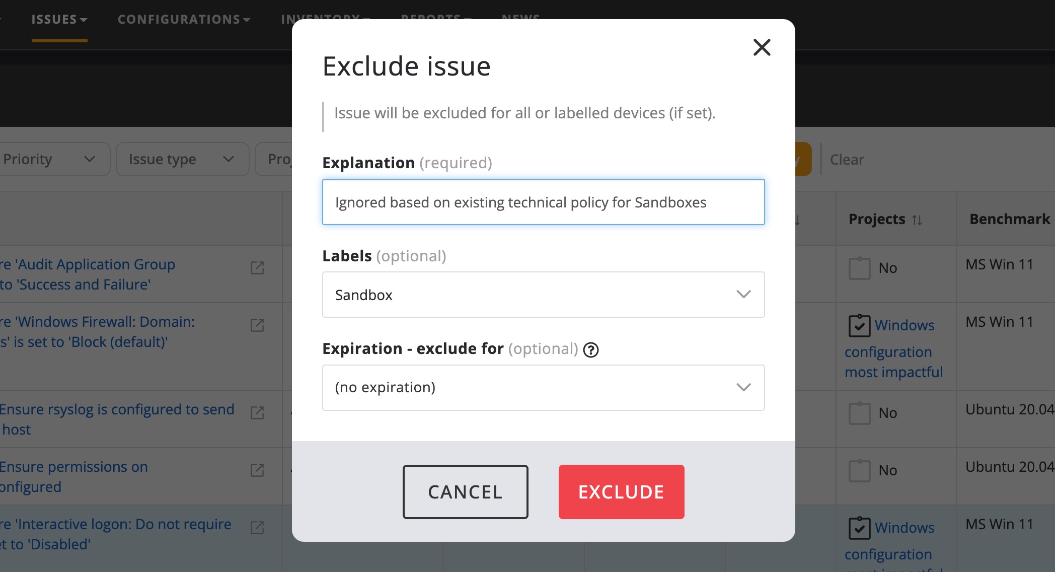 Each issue allows some actions to be taken. An issue can be sent for remediation by assigning it to one or more remediation projects. An issue can also be excluded for cases when a detected issue does not apply to an IT infrastructure or for cases where according to your existing technical policy the risk of an incident is considered acceptable. Both remediation projects and issue exceptions can be applied globally or for a limited set of assets by defining a set of labels to which projects and exclusions apply.