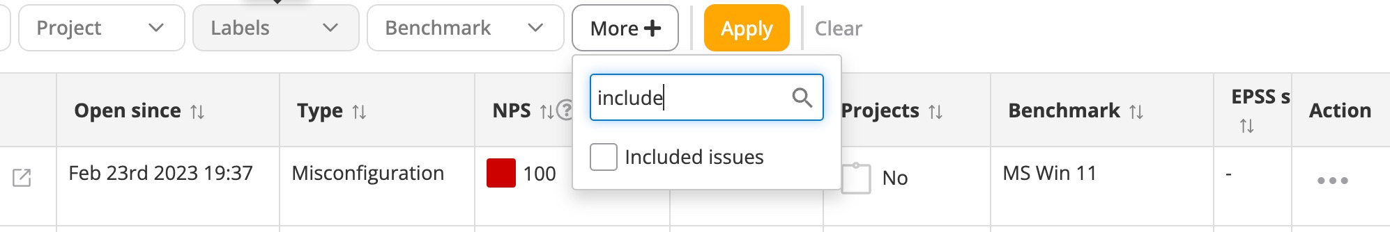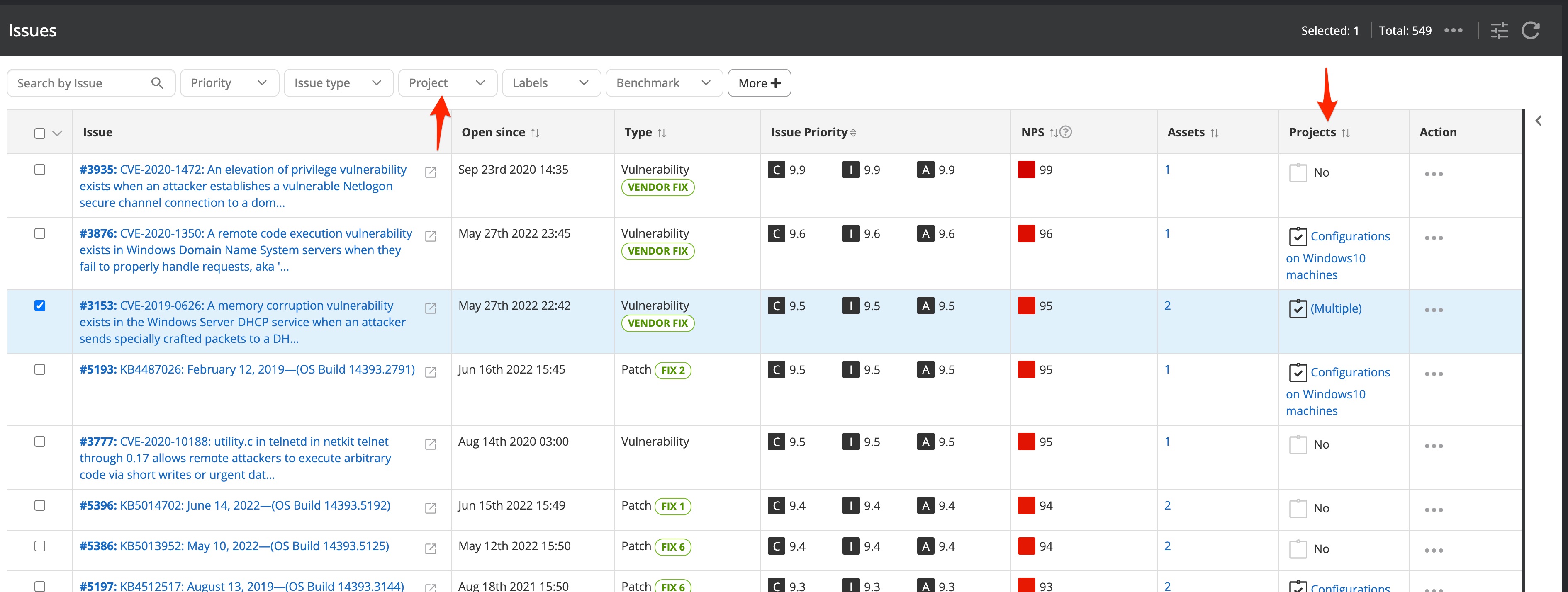 Additionally, the issue list can be filtered on projects, either to find issues assigned to specific projects or issues that have not been assigned to any project. Issues in the P0 or P1 categories should always be addressed by assigning them to a project in a timely manner (within 30 days) to reduce the risk of an exploit.