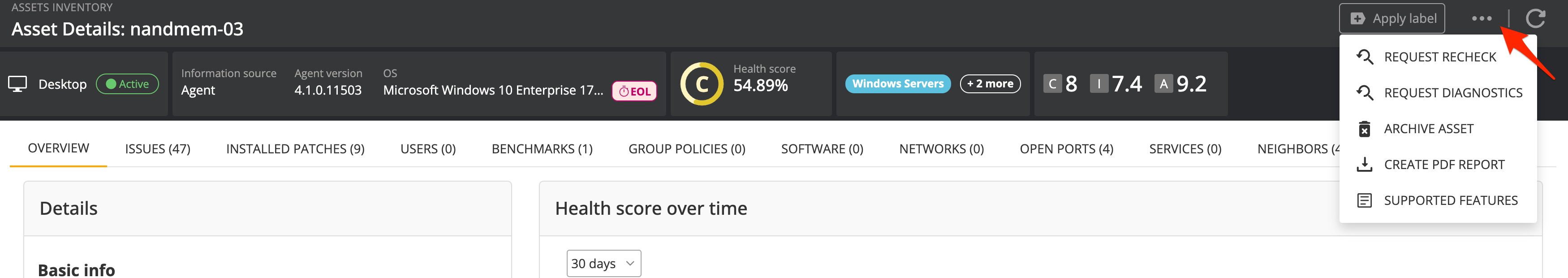 On the asset detail page, you will find a range of actions available to help you manage the asset, such as applying labels, archiving it, requesting a checkin, requesting the agent's diagnostic logs, viewing supported features, and more. These actions are available either through an available button or the actions menu in the page header