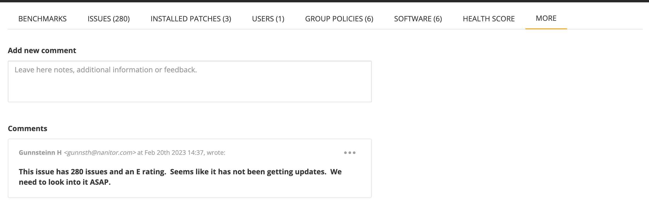 The comments tab provides a list of comments that have been made regarding the asset. This provides a way to discuss an asset, for example, if something is surprising or needs to be looked at.