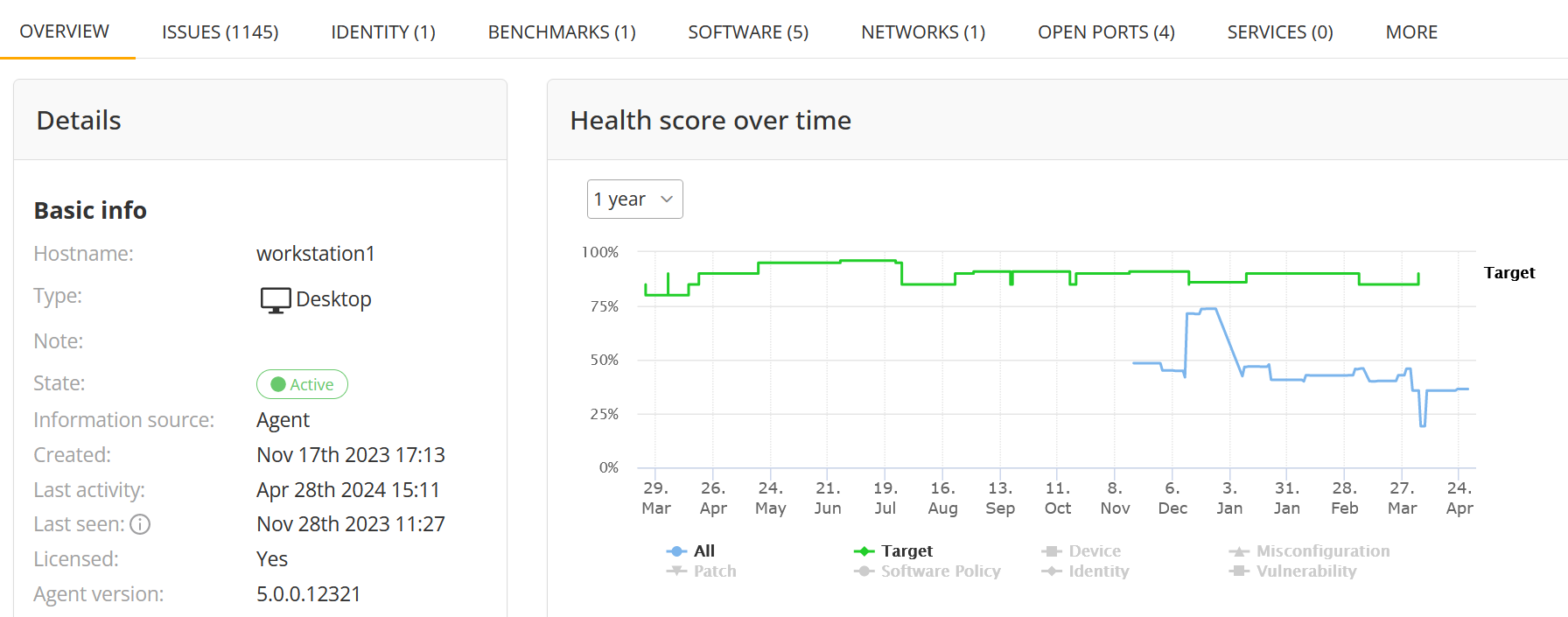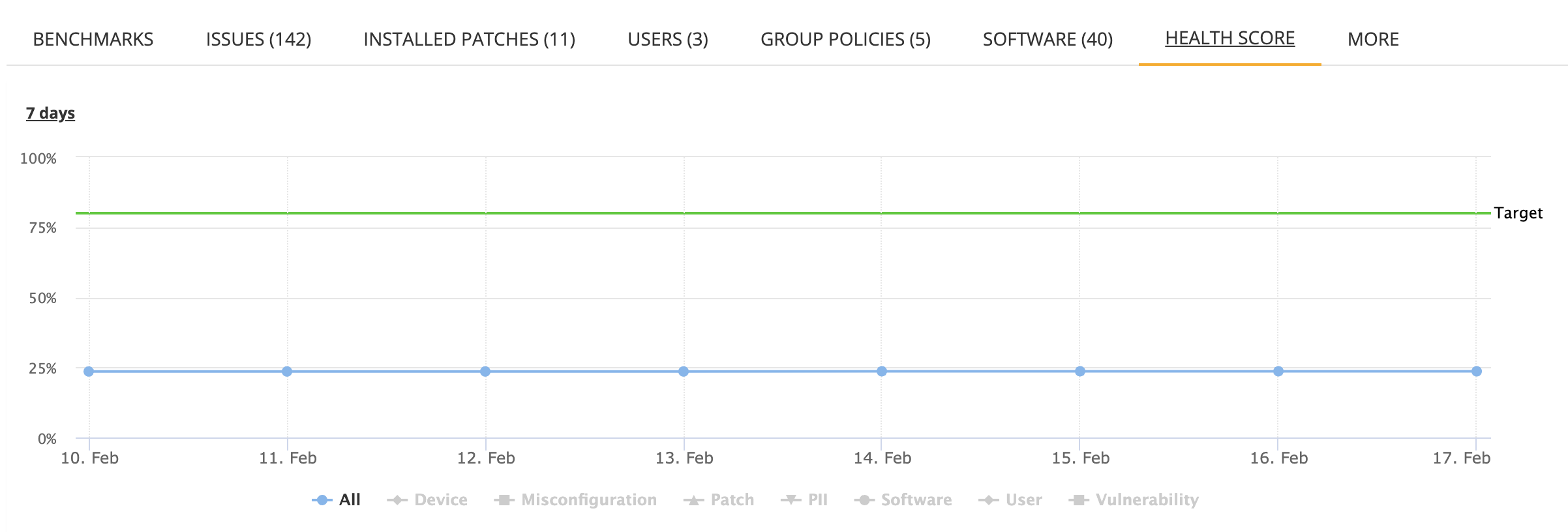 It shows the target health score for the organization and the asset health score over time. In addition, the health scores for certain issue types individually can be seen by clicking on the issue type under the graph (not visible by default).