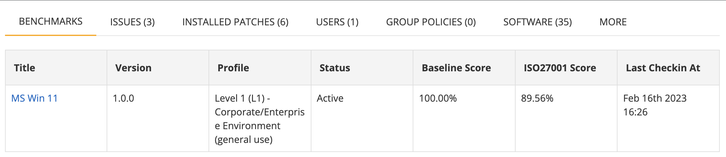 The list shows the benchmarks that currently apply to the asset. For each benchmark, the following information is shown in the columns: