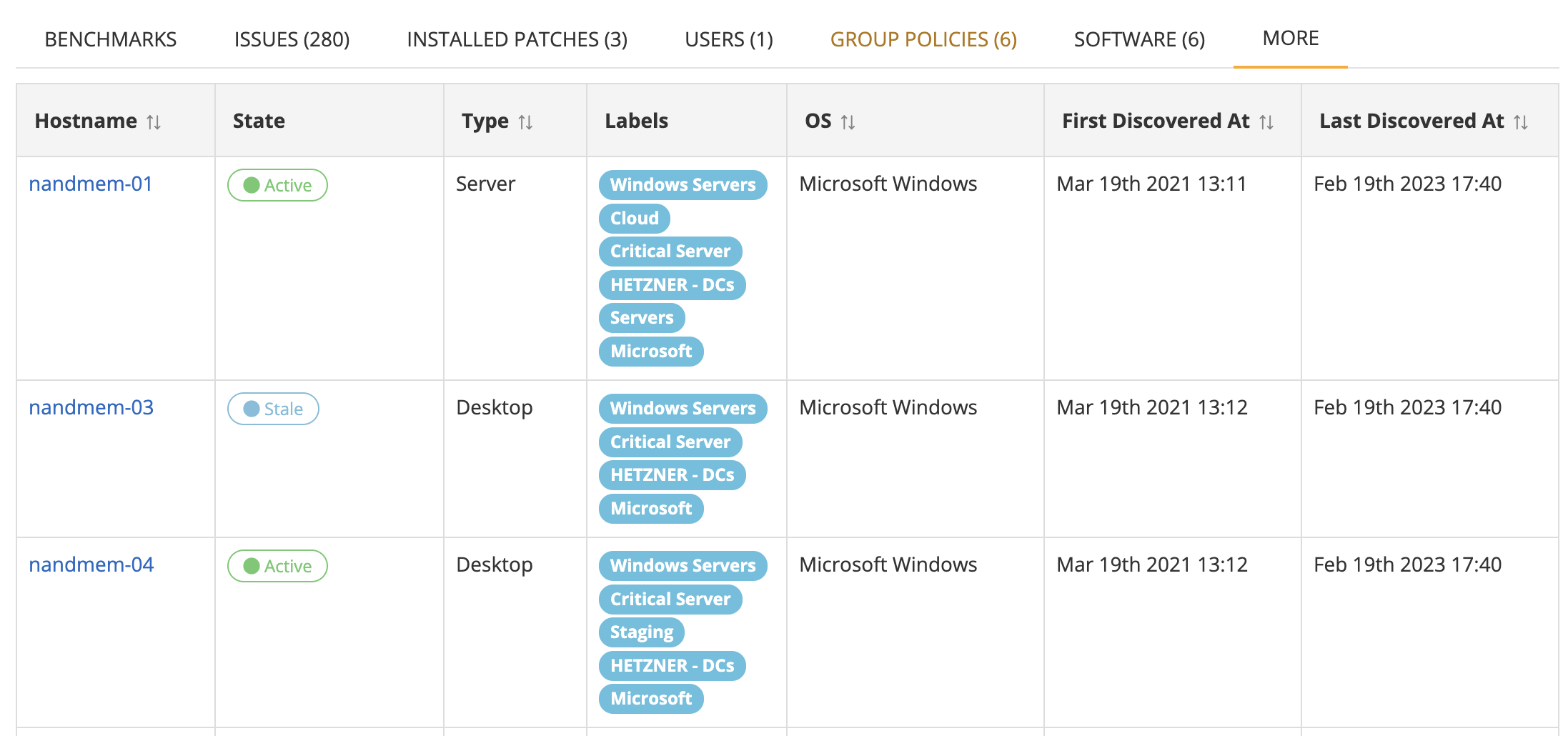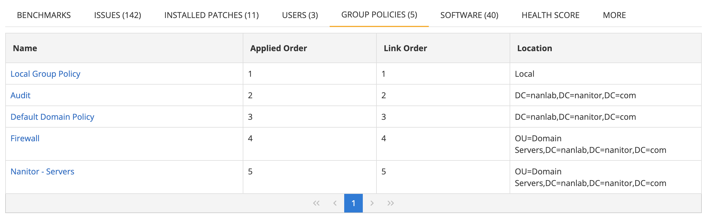 The Group policies inventory list displays group policies (sometimes called group policy objects or GPOs) that are active on the asset along with information such as application order, etc. Can be useful to debug why settings are not being applied correctly.