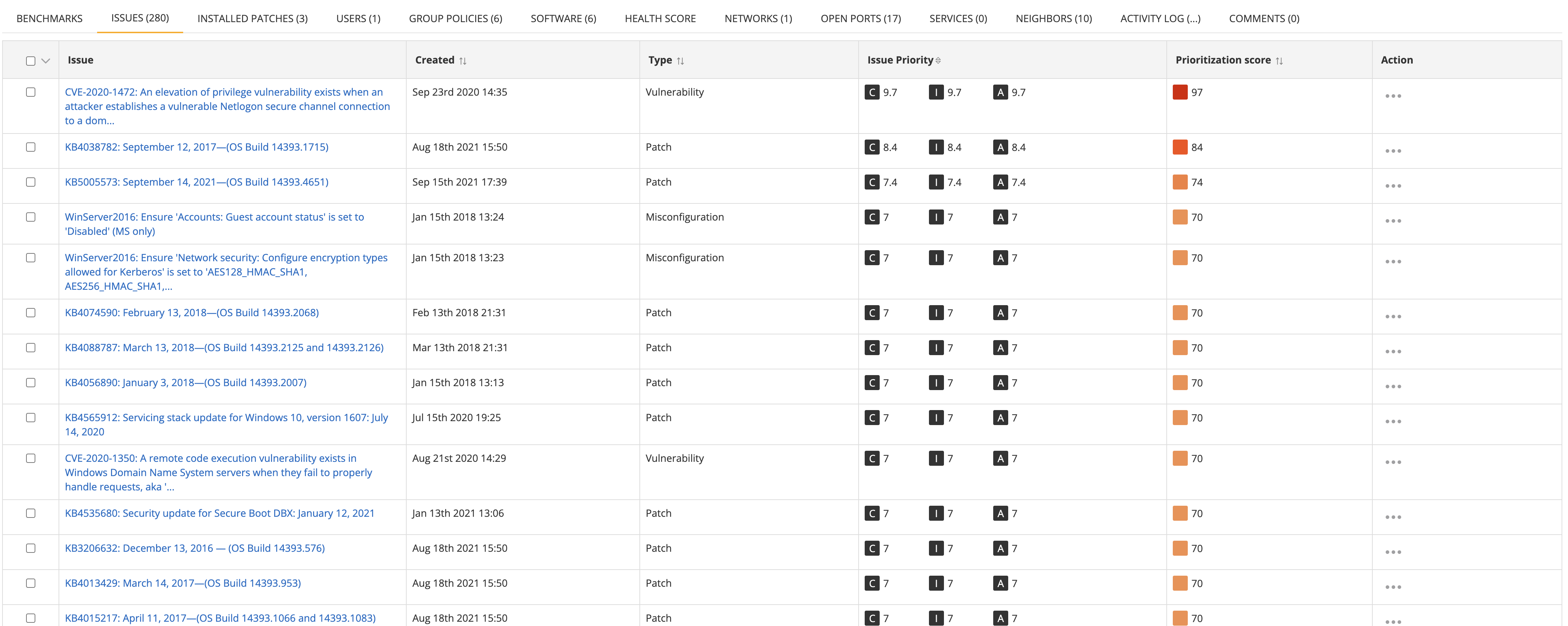 | Prioritization score | The prioritization score of the issue, which is determined by multiplying the issue priority and asset priority and taking the highest component. |