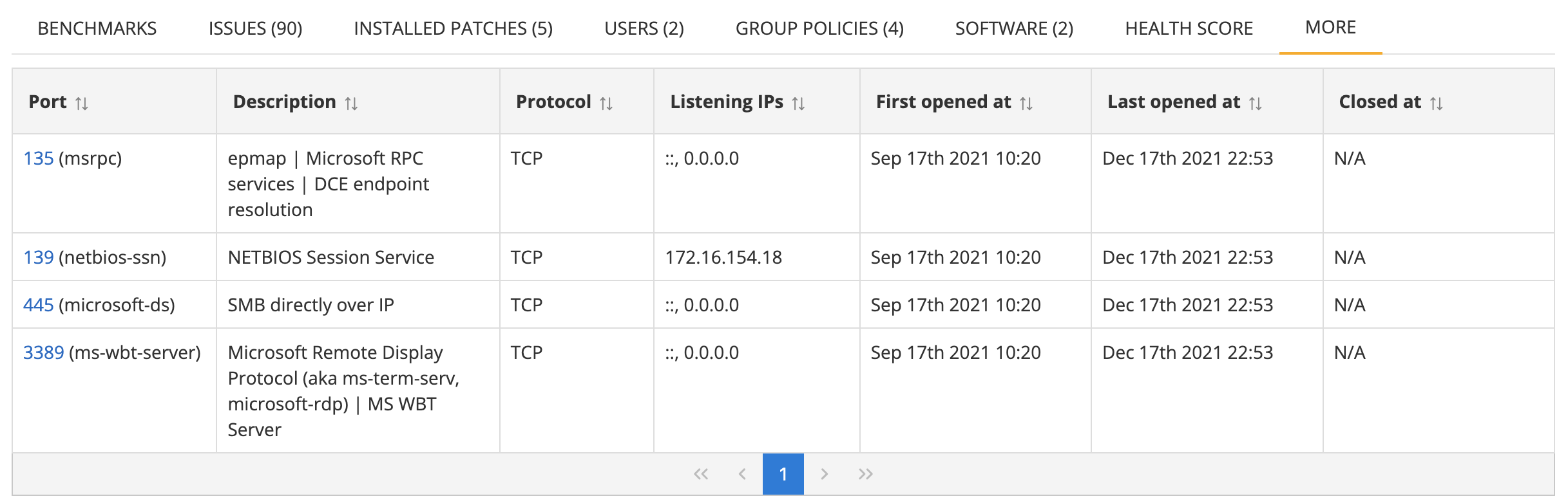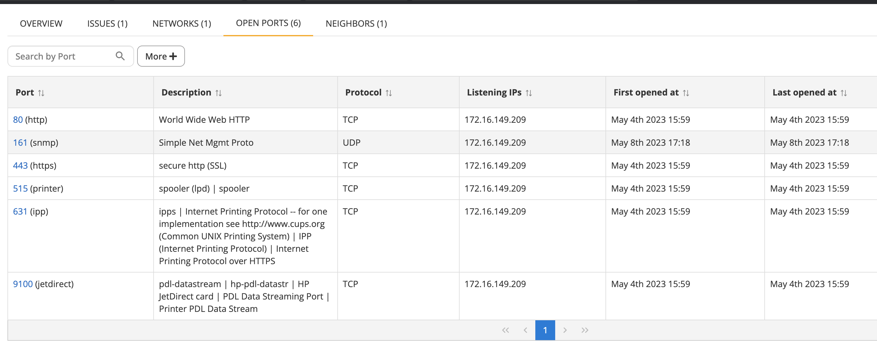 SNMP information will be shown there if available, while if open ports are found, the number will link to the Open ports tab. There, you can see information about the ports open on the asset and what well-known services use these ports: