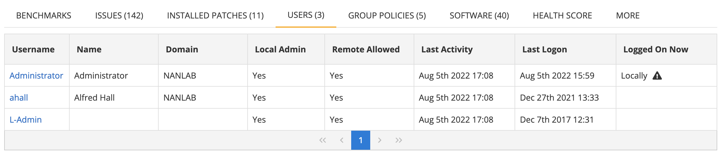- Logged On Now: "Locally" if the user is currently logged in locally on the computer, "Remote" if the user is remotely logged in. The warning triangle indicates that the information may be old if the asset has not checked in recently.