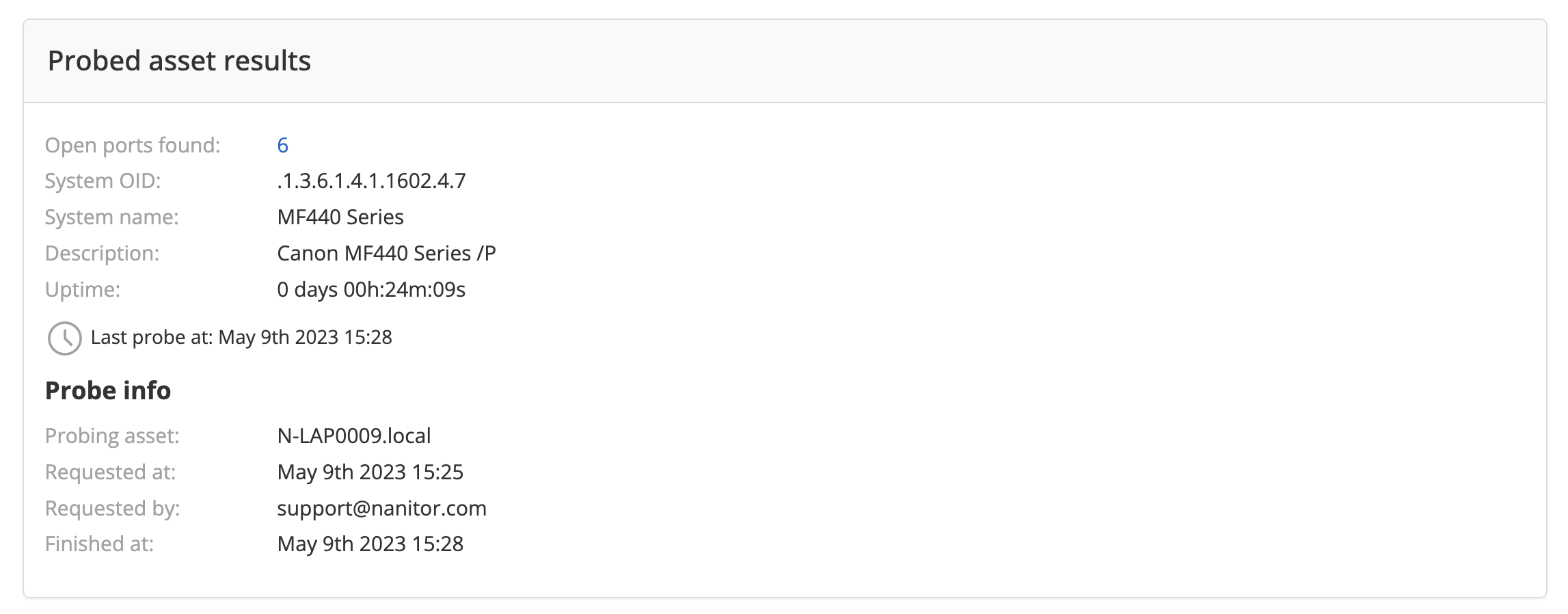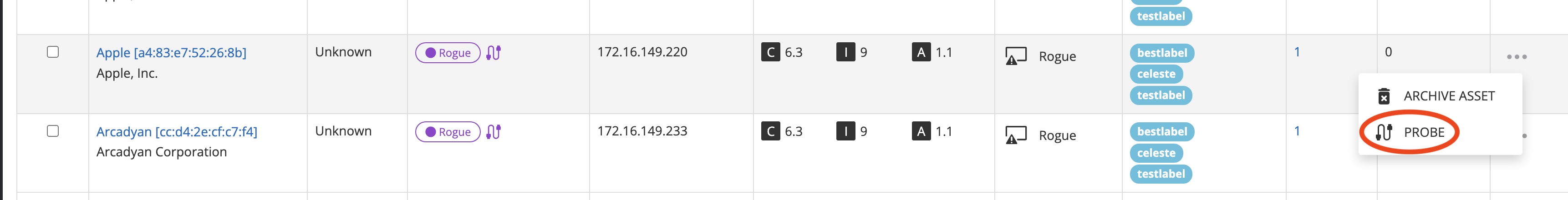 The Probe action is available for a rogue asset if port probing has been enabled by an organization admin (Settings -> General -> Network Discovery), allowing the user to probe it for more information. Port probing involves attempting to connect to various well-known ports on the asset to identify whether common services are running, giving a better idea of what the asset is. If SNMP probing is also enabled, the probe will also fetch information on the asset's make and manufacturer through the Simple Network Management Protocol.