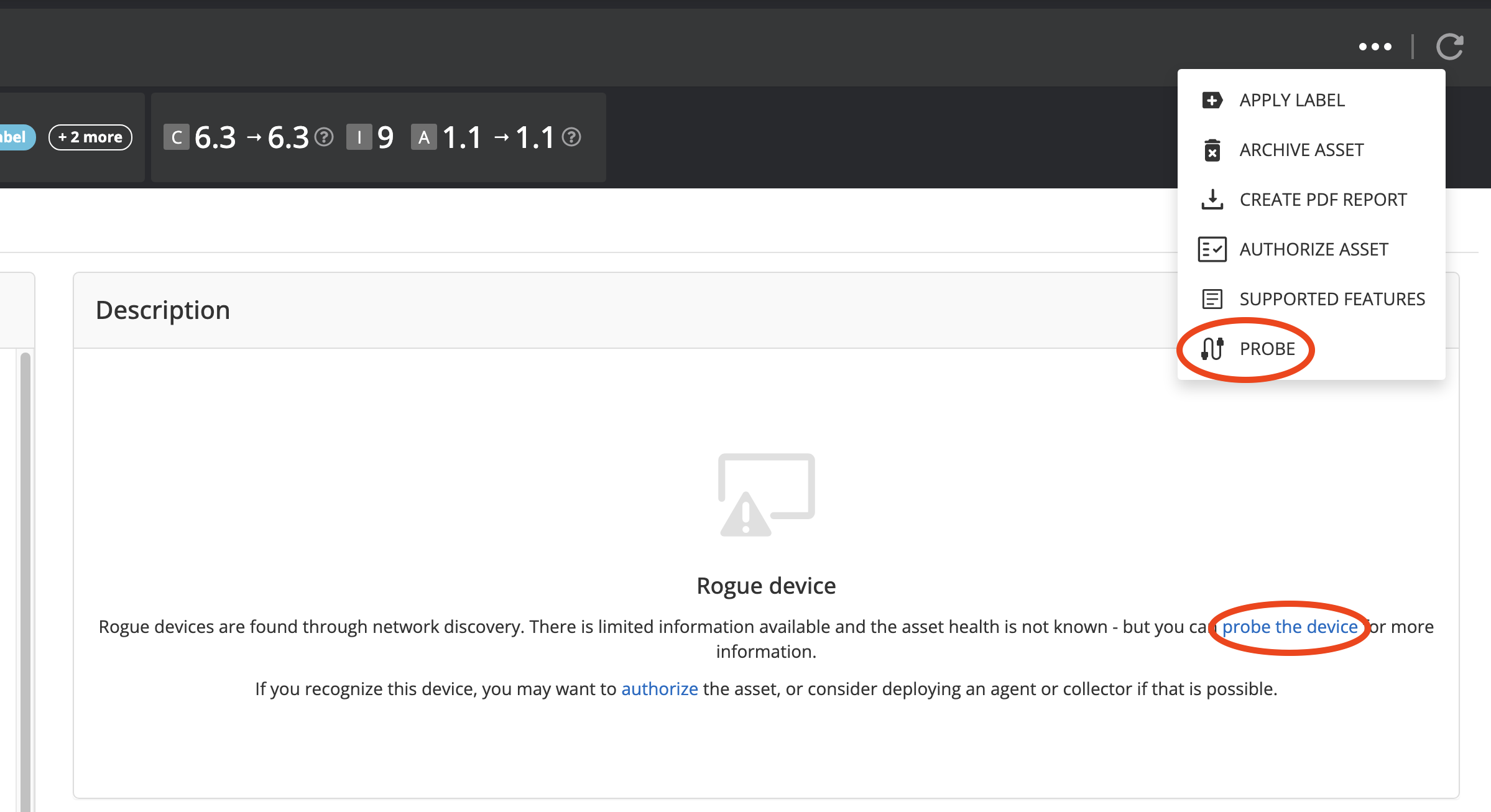 When viewing the details of an unauthorized rogue device, a probe can be initiated either from a link in the "Description" panel or from the action menu: