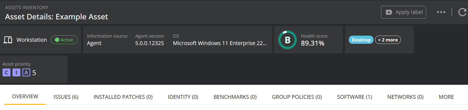 Asset overview (page header): This includes asset fields such as State, Asset type, etc.; asset health score; asset labels; and asset priority of the asset in terms of Confidentiality (C), Integrity (I), and Availability (A).