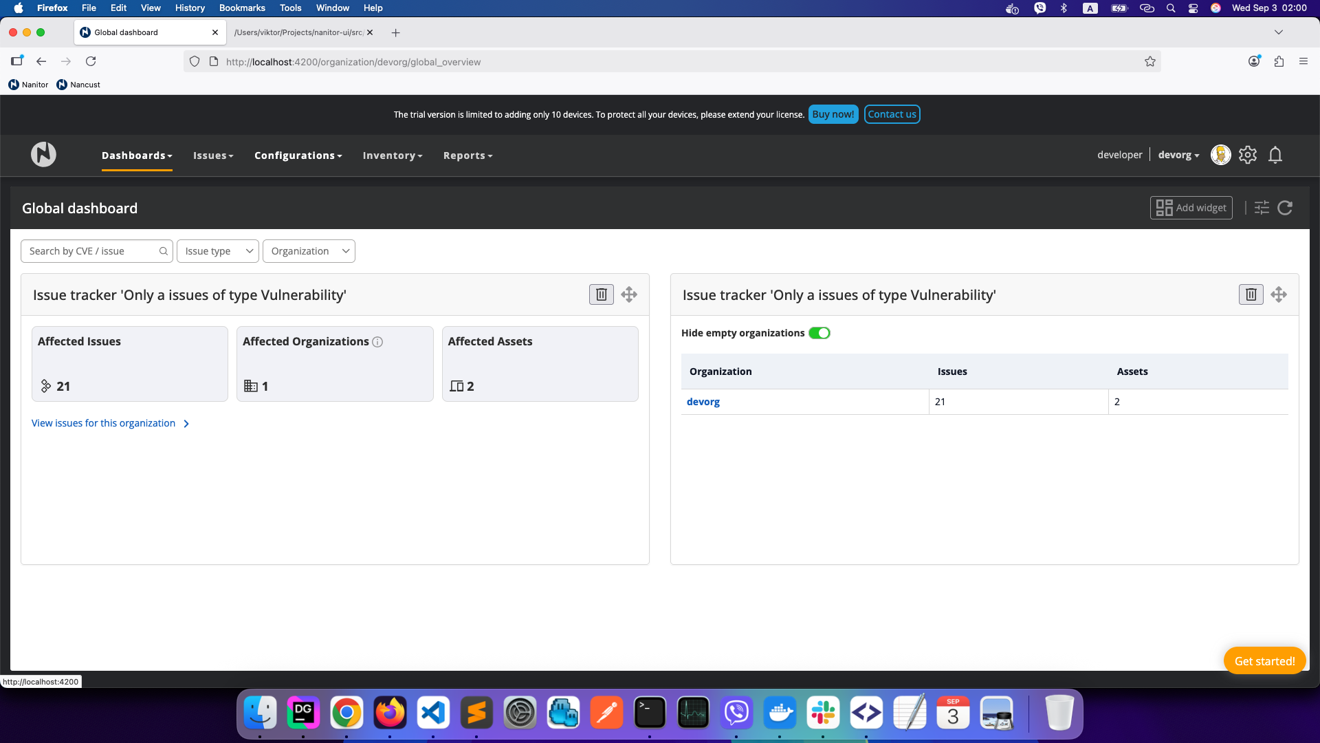 Issue Tracker widgets let you pin your saved issue filters directly onto the Global dashboard as live monitoring cards. This is useful for tracking specific concerns — such as a critical CVE, a compliance gap, or a category of vulnerabilities — across all your organizations at a glance.