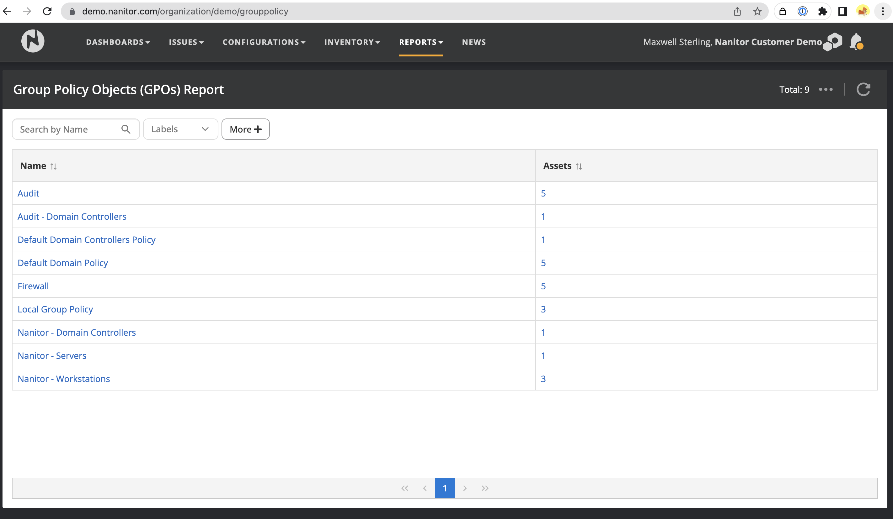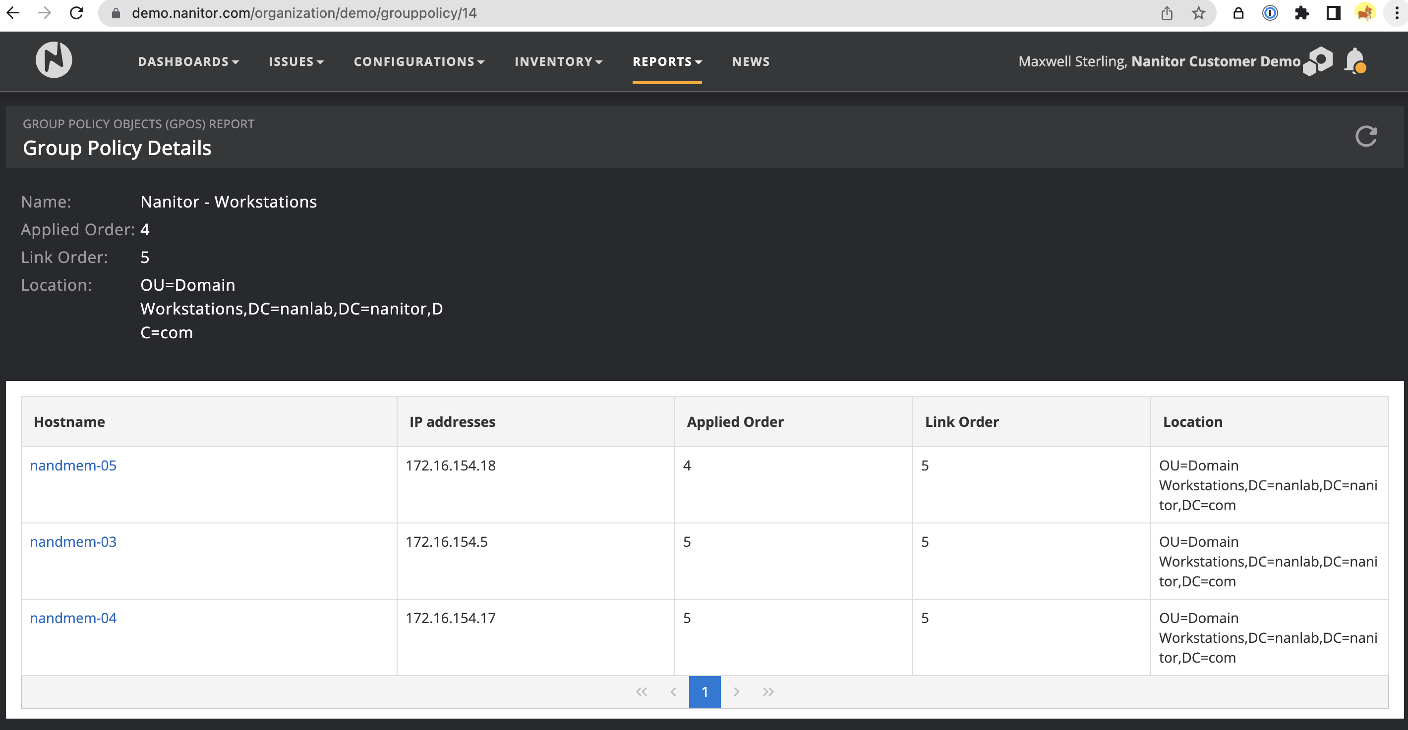 By clicking on the GPO name, or the number of assets in the GPO report, one gets a detailed report for a given GPO.