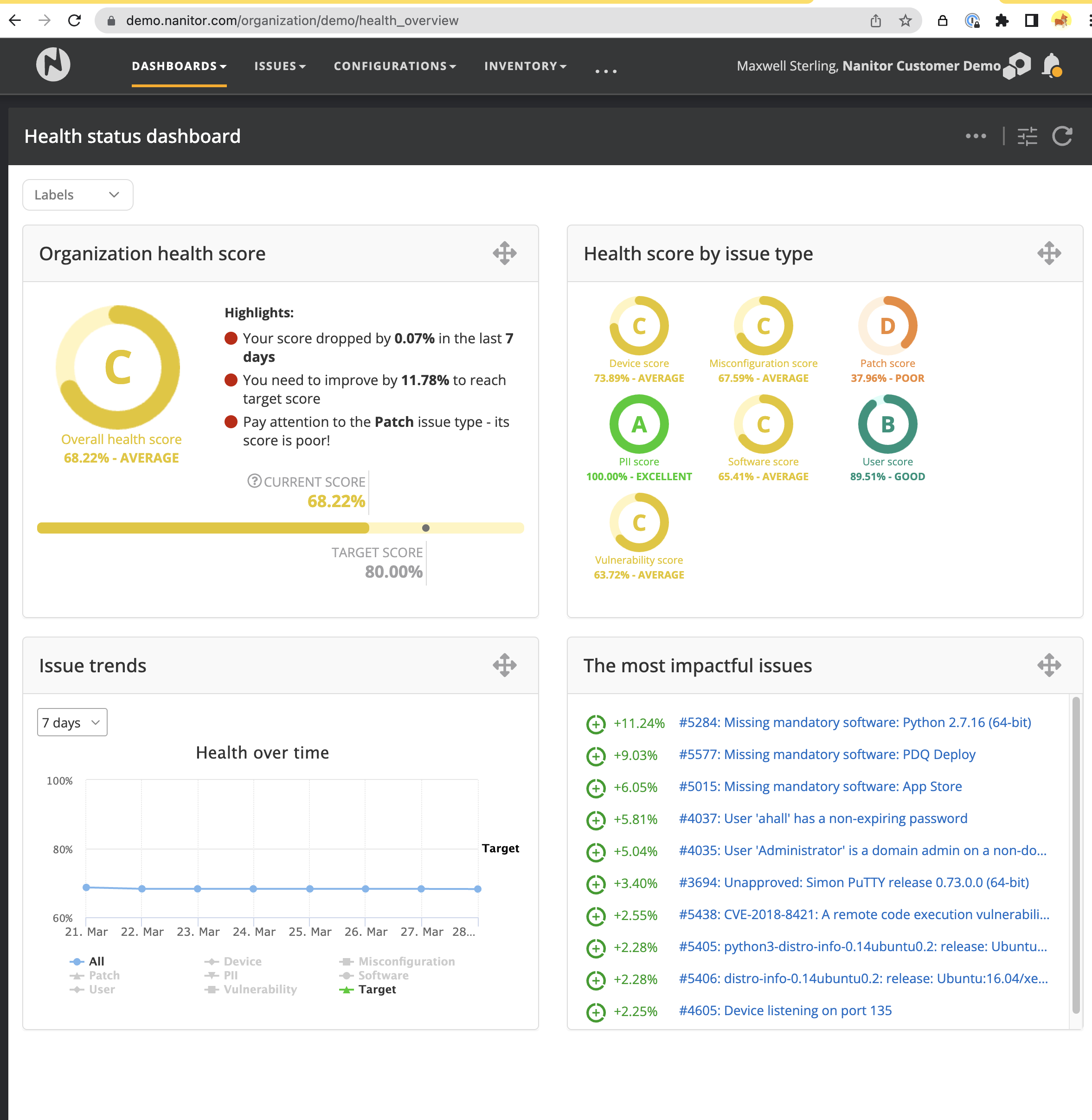 Within Nanitor, Health is a comprehensive approach to tracking the overall security posture of your organization, based on the fundamental security areas that Nanitor provides checks for. To learn more about how Health works and how to optimize its use, see the User Guide - Health page.