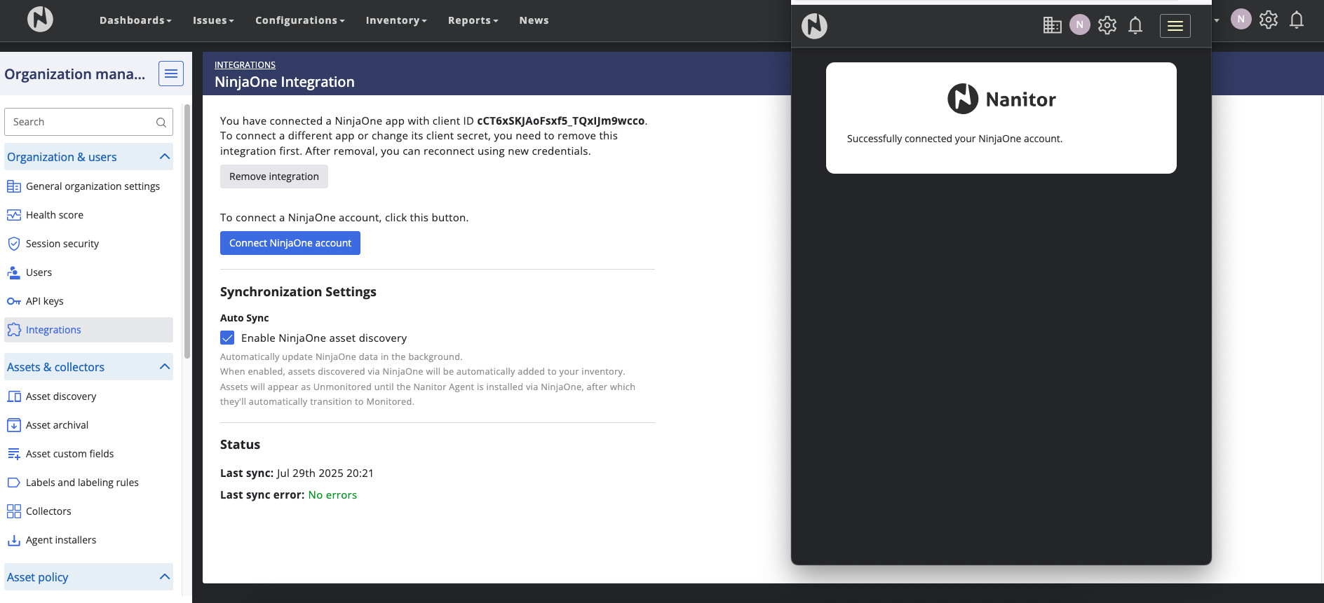 - Automatic device matching links NinjaOne devices to existing Nanitor assets using serial numbers as the primary method
