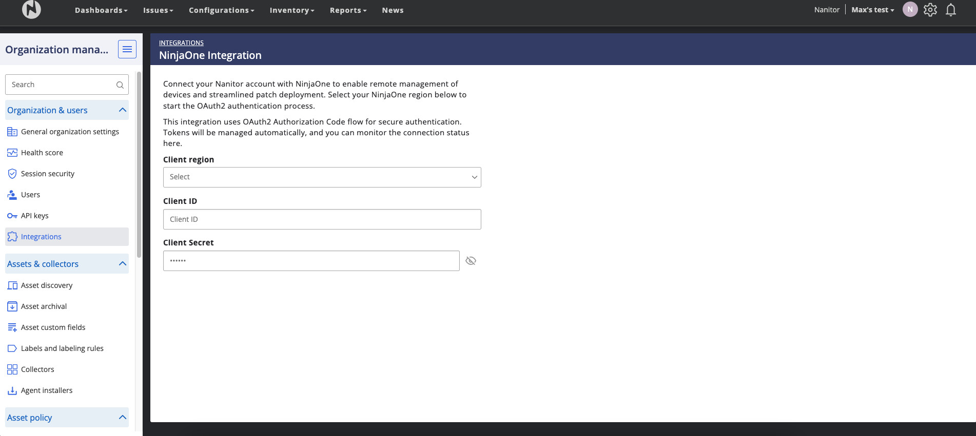 Once you have obtained your credentials from NinjaOne, configure the integration in Nanitor.