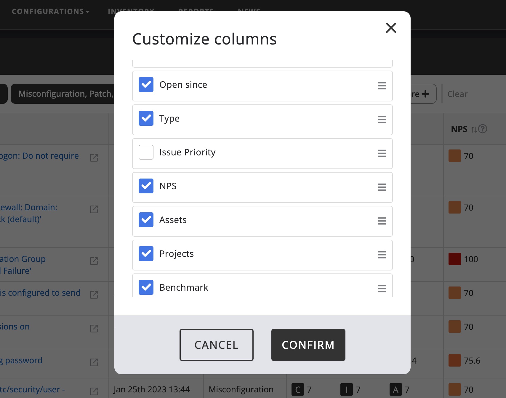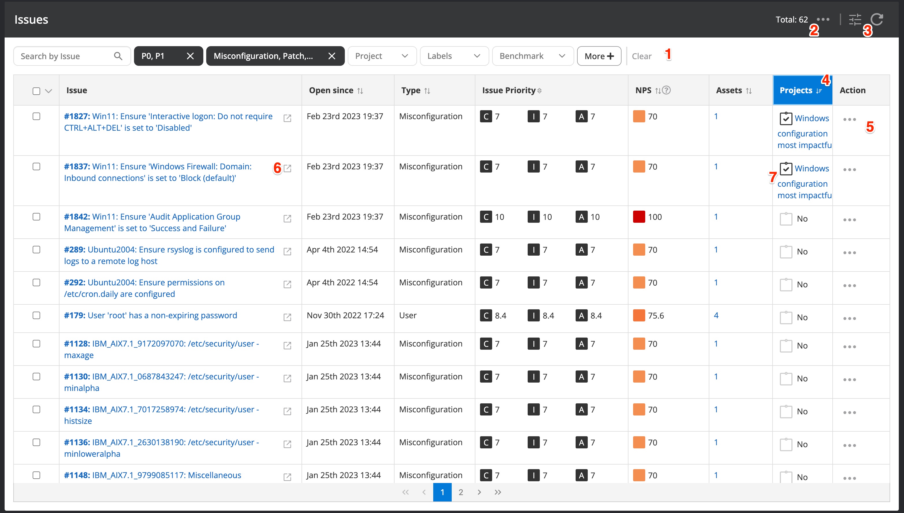 On the top right (2) you will see the total number of detected issues according to the applied filter. In the same area, you can get an option to export the filtered issue list to a CSV format. If you need to include other columns that might be of interest you can select other available additional information for the issue list from there as well (3).
