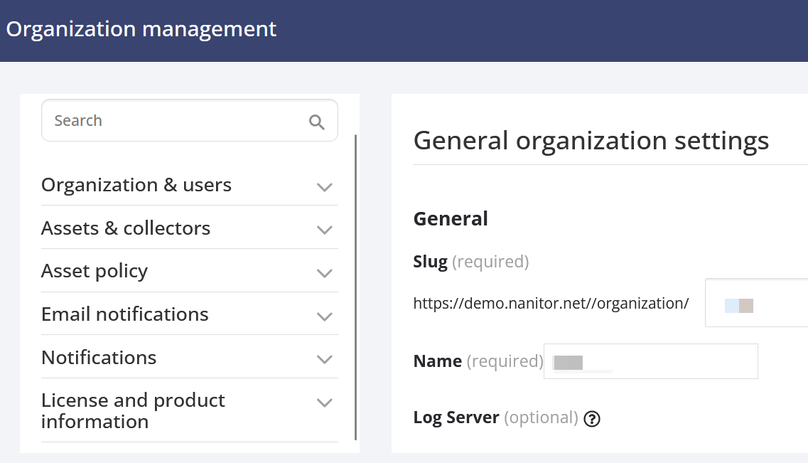 - General organization settings: They include organization slug and name, log server settings, the vulnerabilities checking option (either the vulnerabilities checks are enabled or disabled), and automatic Agent upgrades setting. For suborganizations, the Enable vulnerability checking and management and Enable automatic agent upgrade options are inherited from the parent organization and cannot be changed.