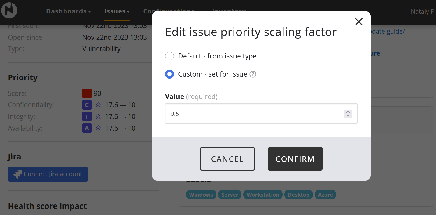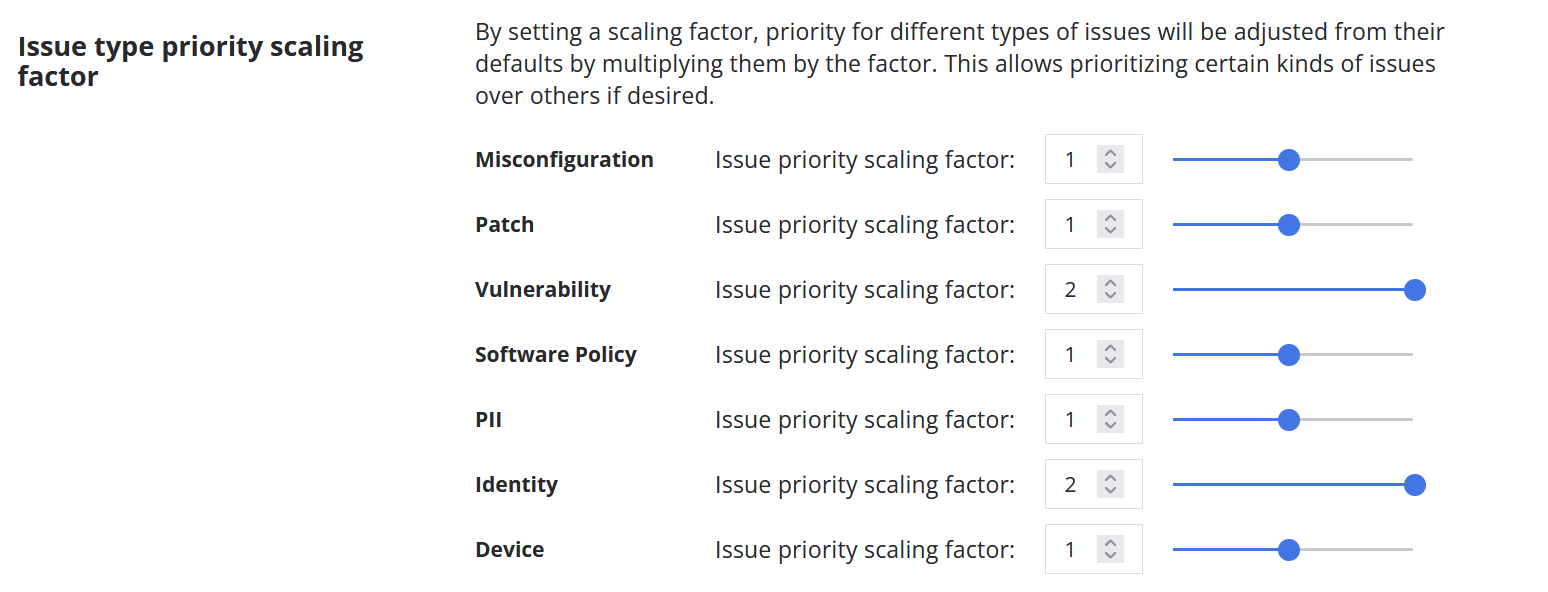 Furthermore, under Organization Management → Issue configuration, a priority scaling factor can be applied to each issue type individually. If your company considers a certain type of issue more or less important relative to others than the default scores assigned by Nanitor suggest, you can adjust their relative weights by altering these values.