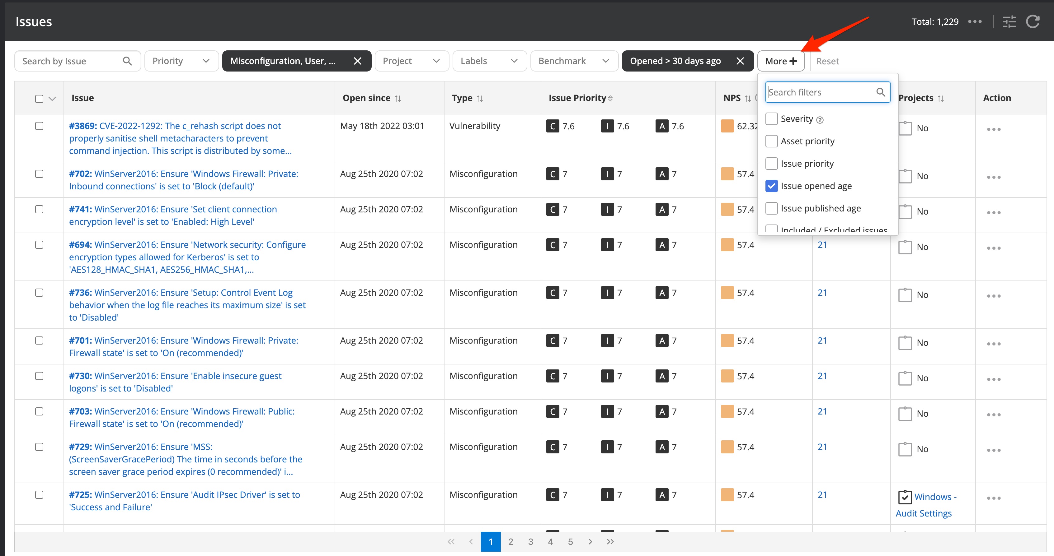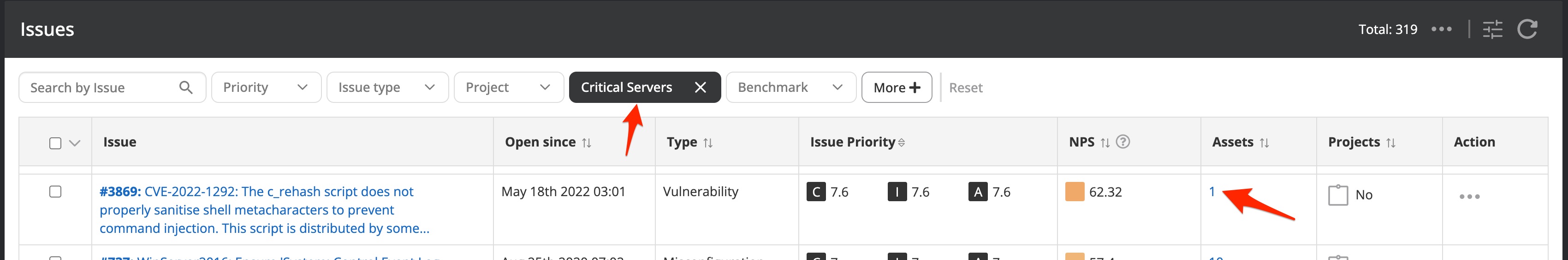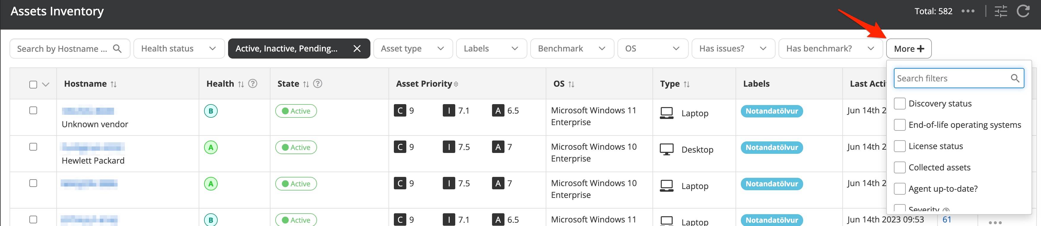 Similar to searching for issues you can leverage various filtering options to view assets of your interest. Clicking on the more button will reveal the full list of options to filter on.