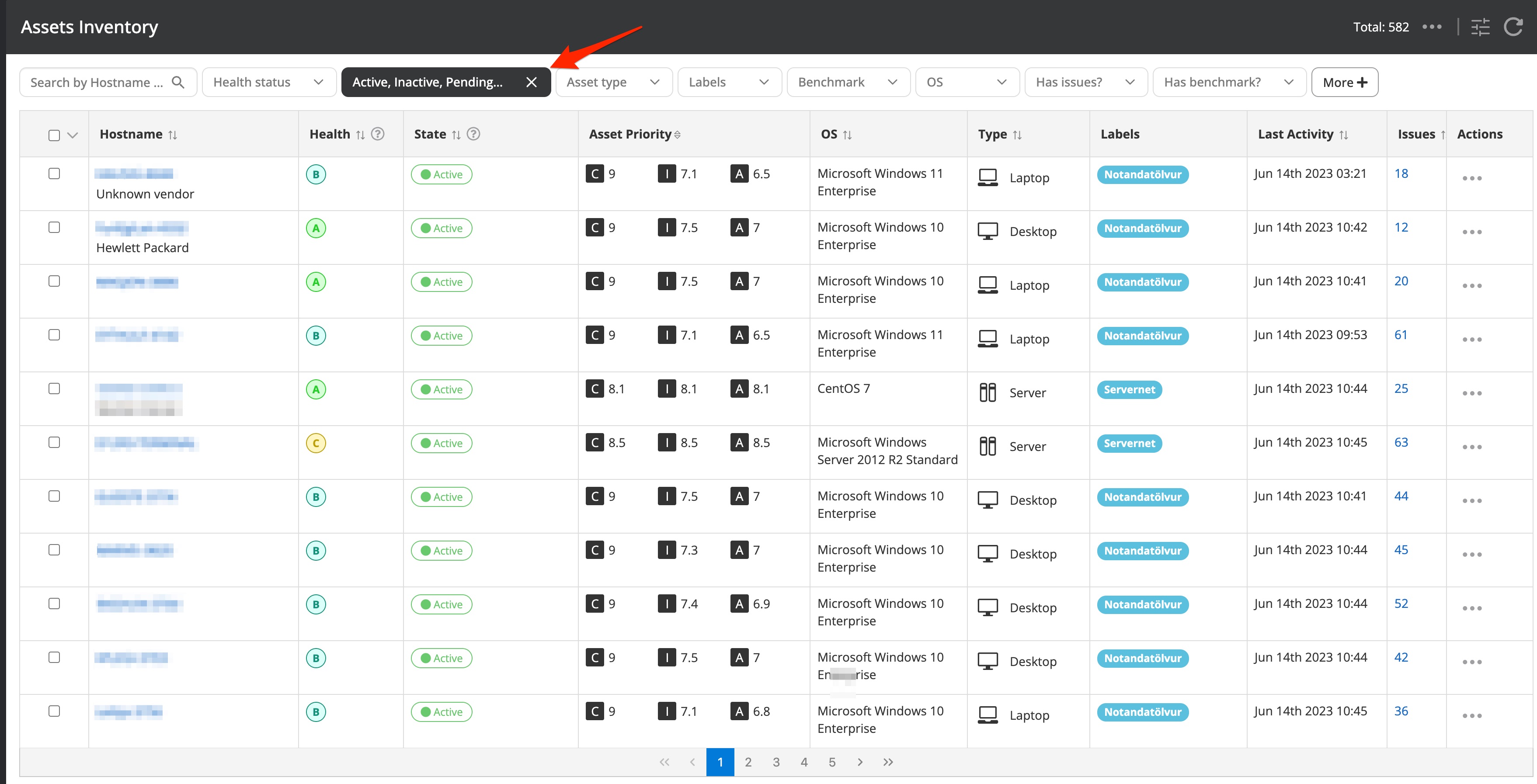 The default view shows all assets besides archived ones. Archived assets are assets that have been decommissioned or stopped reporting into Nanitor longer than the threshold of the asset archival policy (can be adjusted under Settings → Organization Management → Asset Archival). It is fundamental to understand the various states an asset can be in.