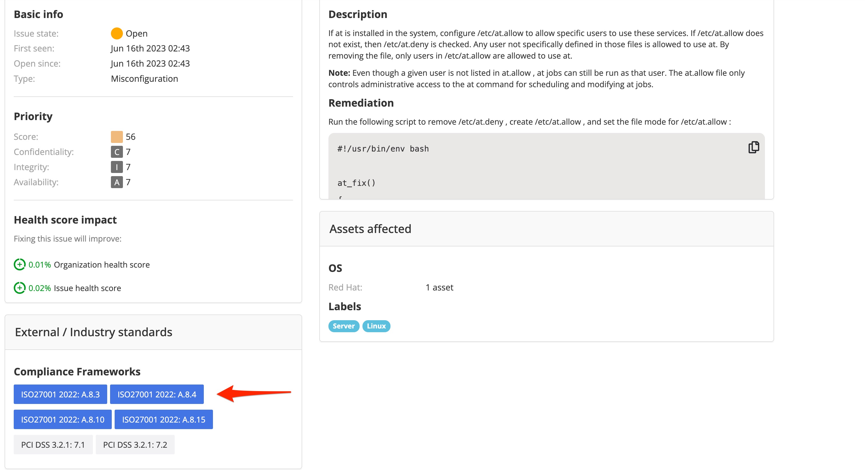 The Compliance issue report shows all relevant chapters and subchapters of the compliance framework and matches detected issues to one or more chapters if they apply. The matching is done by Nanitor security experts. Within the details of a detected issue, you can see what compliance frameworks the issue matches to.