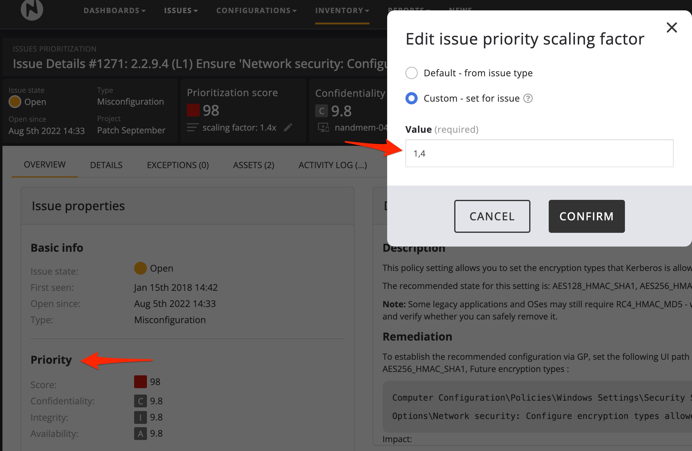 Nanitor has an intelligent scoring system for its detected issue and should be accurate on most occasions. However, each IT environment is different and some areas can be more important for certain businesses. For those cases, the issue priority rating does not reflect the real circumstances and needs adjustment. That can be achieved in Nanitor on a global basis for certain issue types (Organization management → Settings → Issues → Issue type priority scaling factor). A scaling factor will higher (or lower) the issue's priority. But instead of doing this on a global basis, it can also be done on the issue level by lifting (or lowering) the priority of a single detected issue.