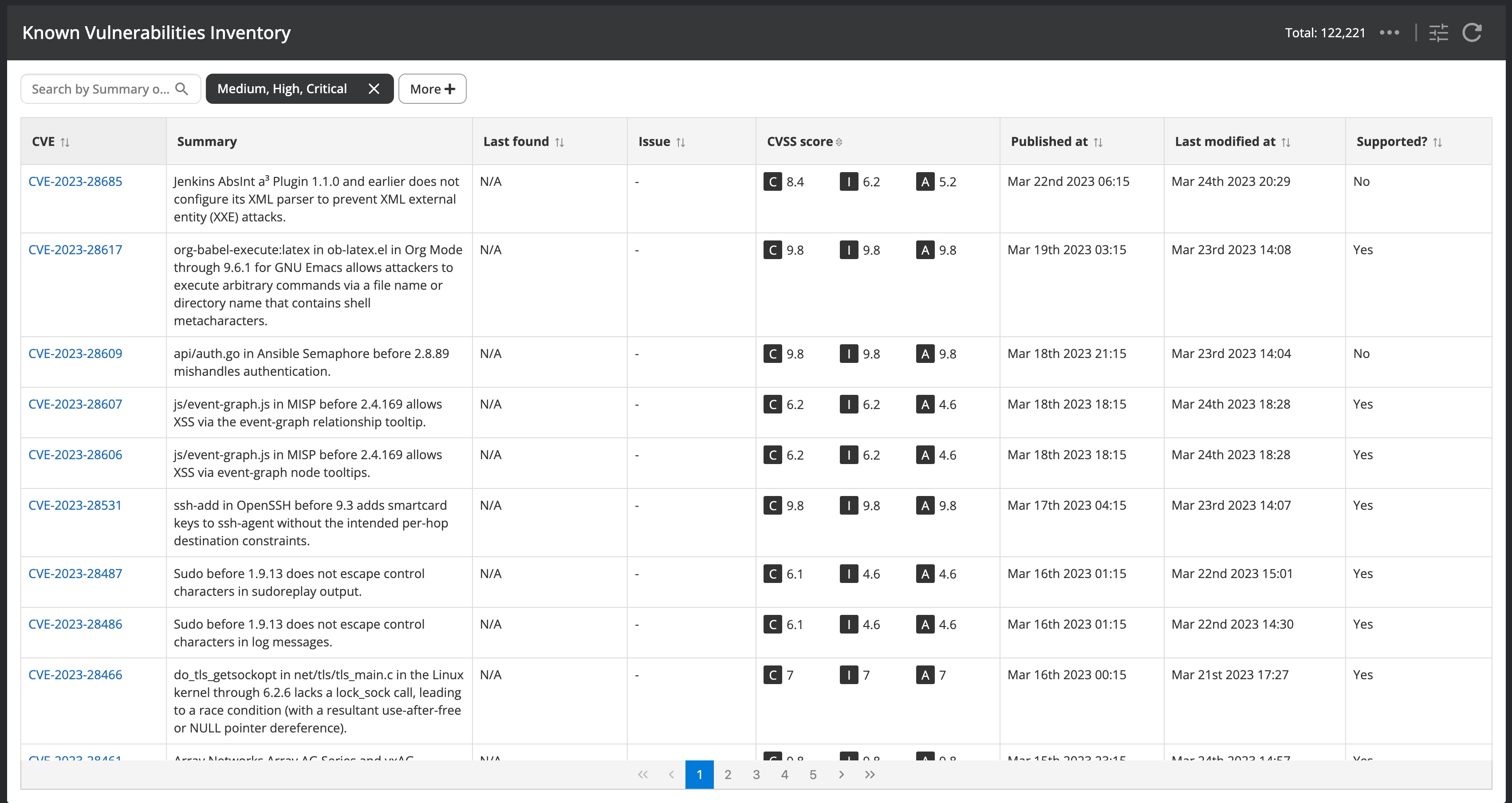 Besides the ability to search on detected issues, you might also be interested in knowing if a certain vulnerability can be in general detected by Nanitor. Nanitor maintains a source list of vulnerabilities more detailed are these vulnerabilities with a CVE number issues by the MITRE cooperation. This list of those vulnerabilities can be viewed by navigating to Inventory → Known Vulnerabilities.
