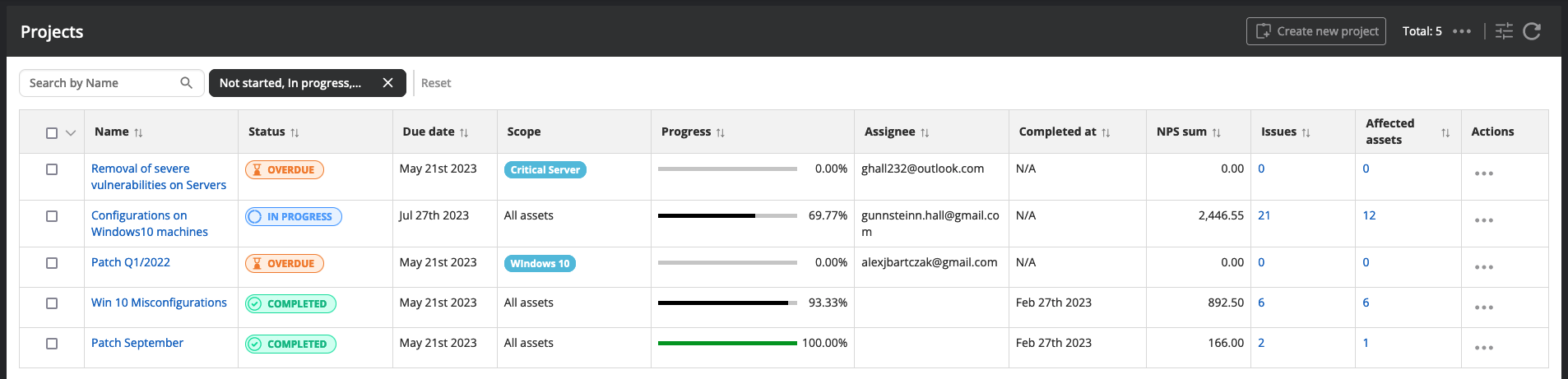 An important part of increasing the organizational cyber security health status is to organize the remediation efforts across teams. A transparent tool is needed to capture decisions from the findings of vulnerabilities in Nanitor and make collaboration on cyber security efforts within your organization possible. The project module within Nanitor is a suited tool to organize remediation work. A project in that sense might not necessarily mean fixing a vulnerability with an update or adjusting a setting or upgrading the operating system to a maintenance-supported system, but there is often some due diligence needed to decide and investigate how applicable a detected vulnerability is, what the possible impact of a remediation of a vulnerability is by applying a patch or a software update as it might break running applications or services. Nanitor's project capabilities are tailored to the needs to run and manage a vulnerability program since it is not only to remediate existing vulnerabilities but it can also help you to define the target for assets to onboard or setting a target health score for your assets. To get more familiar with Nanitor projects, what they are exactly, a best-practices guide, and how you can leverage projects for reporting purposes it is advised to go through the remediation chapter or the in-depth knowledge base article.