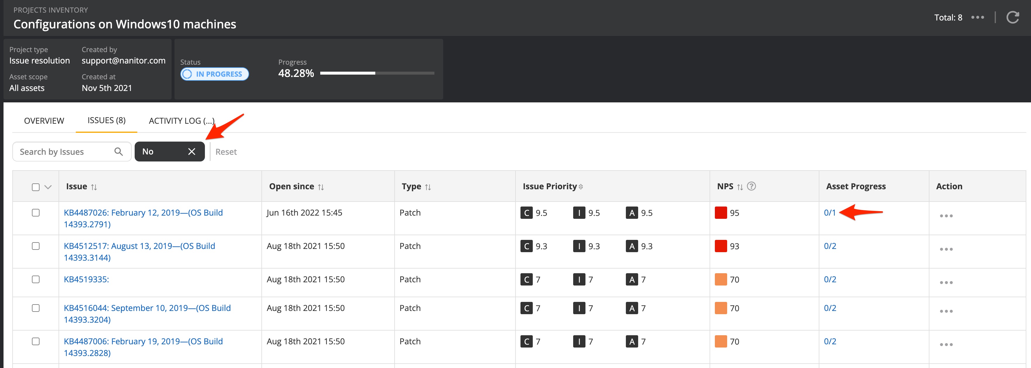 This will bring up a list of remaining issues in the remediation project. The asset column will also indicate how many assets the issue already has been resolved on. Clicking on the link will lead you to the details of the asset list for that issue.