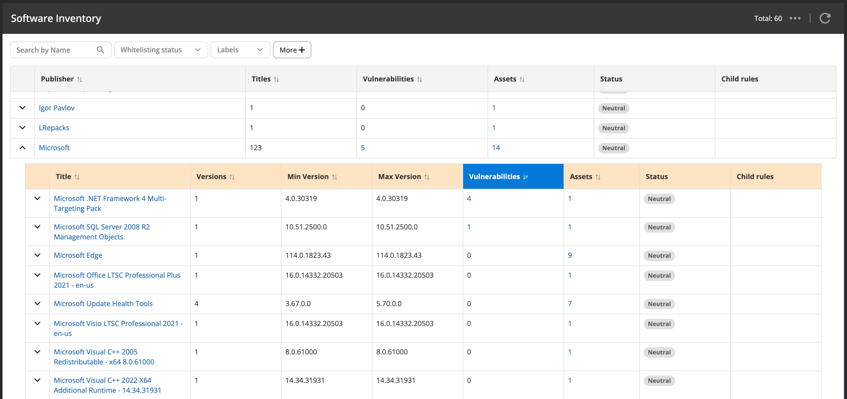 Nanitor keeps track of all installed software on your assets and can be considered a software asset management (SAM) platform. Navigating to Inventory → Software will bring up a list of installed software across your organization. The software inventory list is grouped by the Software vendors, the software title, and the installed versions of the software.