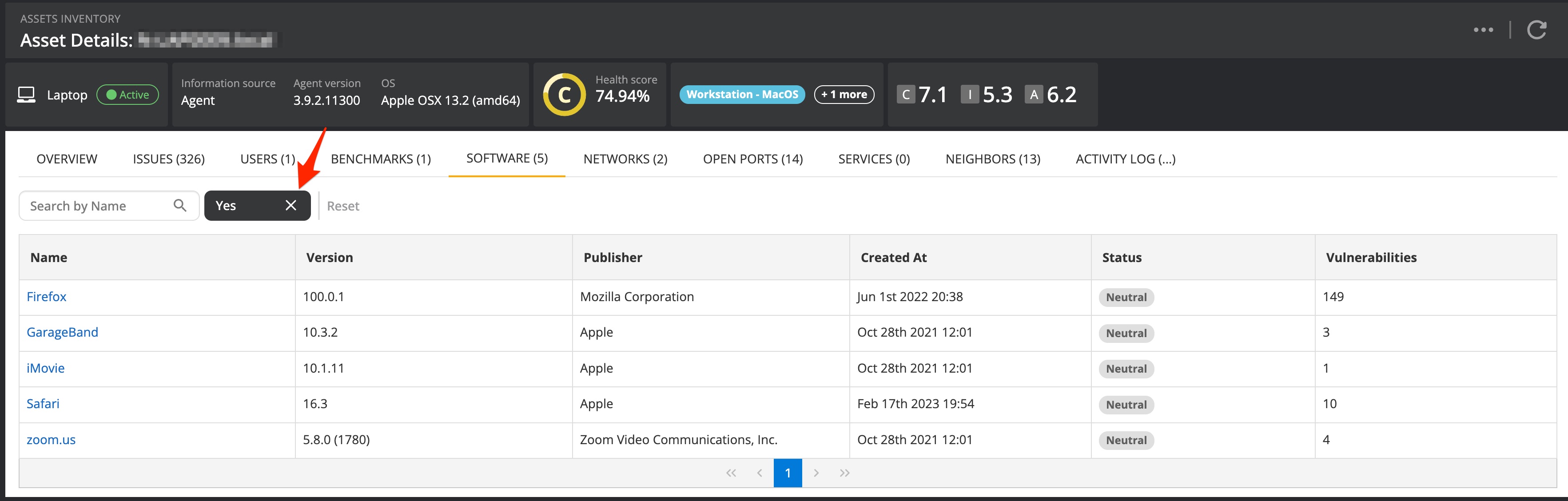 The same approach can be applied when looking at specific assets. The asset view lists the installed software. When you apply the "Has vulnerability" filter you will get a list of software with existing vulnerabilities indicating that this software needs to be patched.