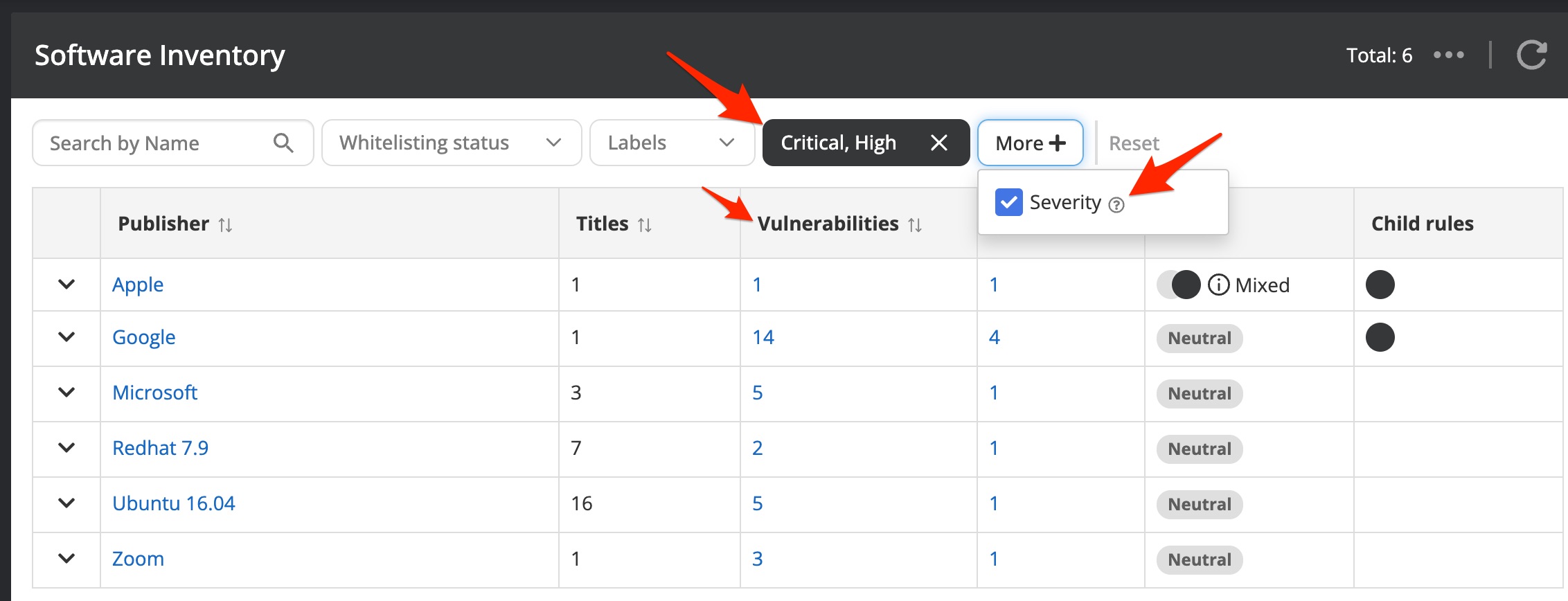 The populated software inventory helps to identify unwanted software and software with outdated versions by blacklisting software. Further, you can define mandatory software that needs to be present on all your assets. Having a software policy in place is not only making you more secure, but it also reduces patching efforts by removing repeatedly vulnerable software. You can identify vulnerable software by applying the severity filter option. After applying the filter you will a list of software with vulnerabilities of the severity grade that you have specified.